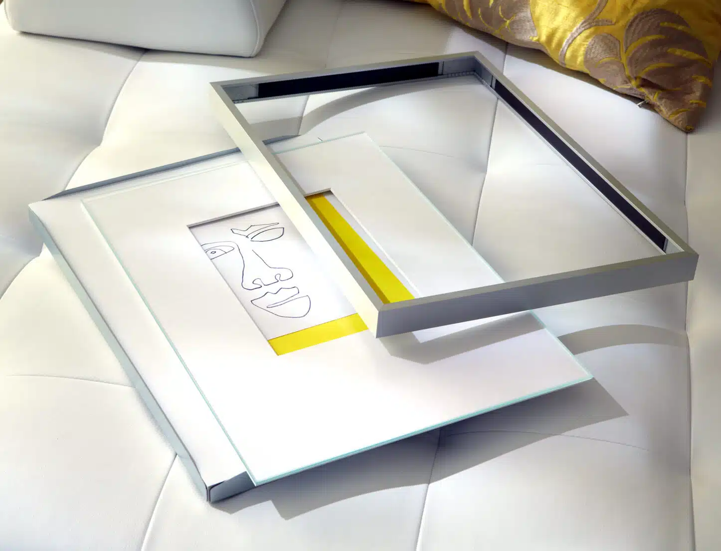 Mit farbigen Anstrichen hinter den Bildern können besondere Akzente gesetzt werden, dies sieht man auch häufig in Museen. In dem Beitragsbild ist zu sehen, wie die Wandgestaltung die gelbe Farbe der Zeichnungen aufnimmt und betont. Die Magnetrahmen hängen an einer Galerieschiene, die die Aufhängung in einer Linie erleichtert.  Aufmerksamkeit können auch Leuchten schaffen, z.B. klassisch über dem Bild. Die Gläser in den Bilderrahmen sollten dann allerdings entspiegelt sein, um starke Reflexionen zu minimieren.