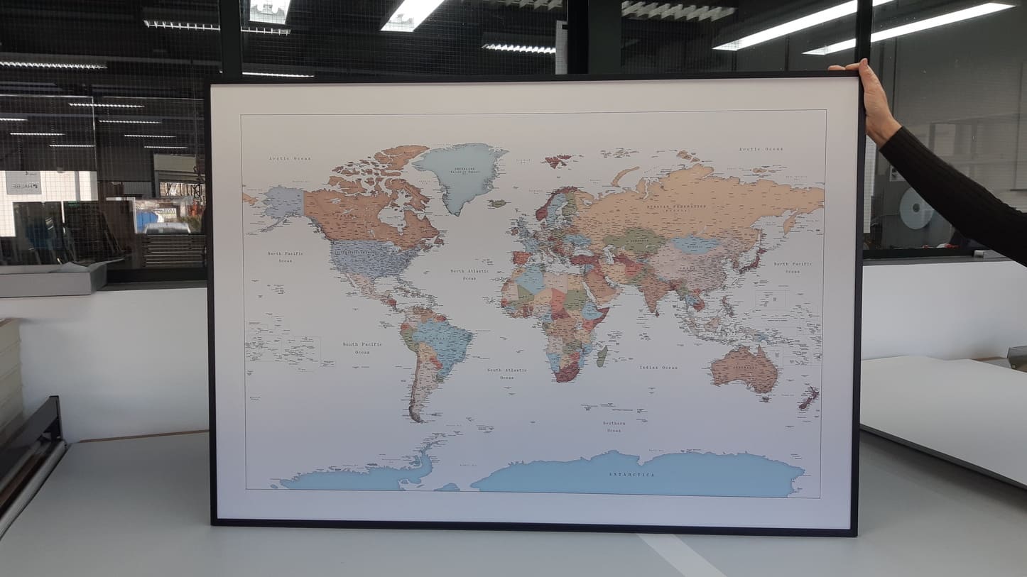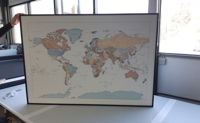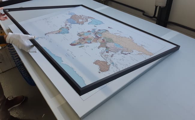 Nachdem die Weltkarte am gewünschten Ort liegt, kann der Überrahmen aufgesetzt werden. Es ist keine zusätzliche Fixierung der Karte notwendig. Der Überrahmen reicht völlig aus. Voraussetzung hierfür ist jedoch, dass der Rahmen an die genauen Maße ihrer Karte angepasst wird. Das ist bei HALBE kein Problem: neben der Vielzahl an gängigen Standardgrößen die wir anbieten, können Sie auch Rahmen in Ihrem individuellen Sondermaß bestellen. Alternativ kann die Karte auch auf ein Normformat zugeschnitten werden.