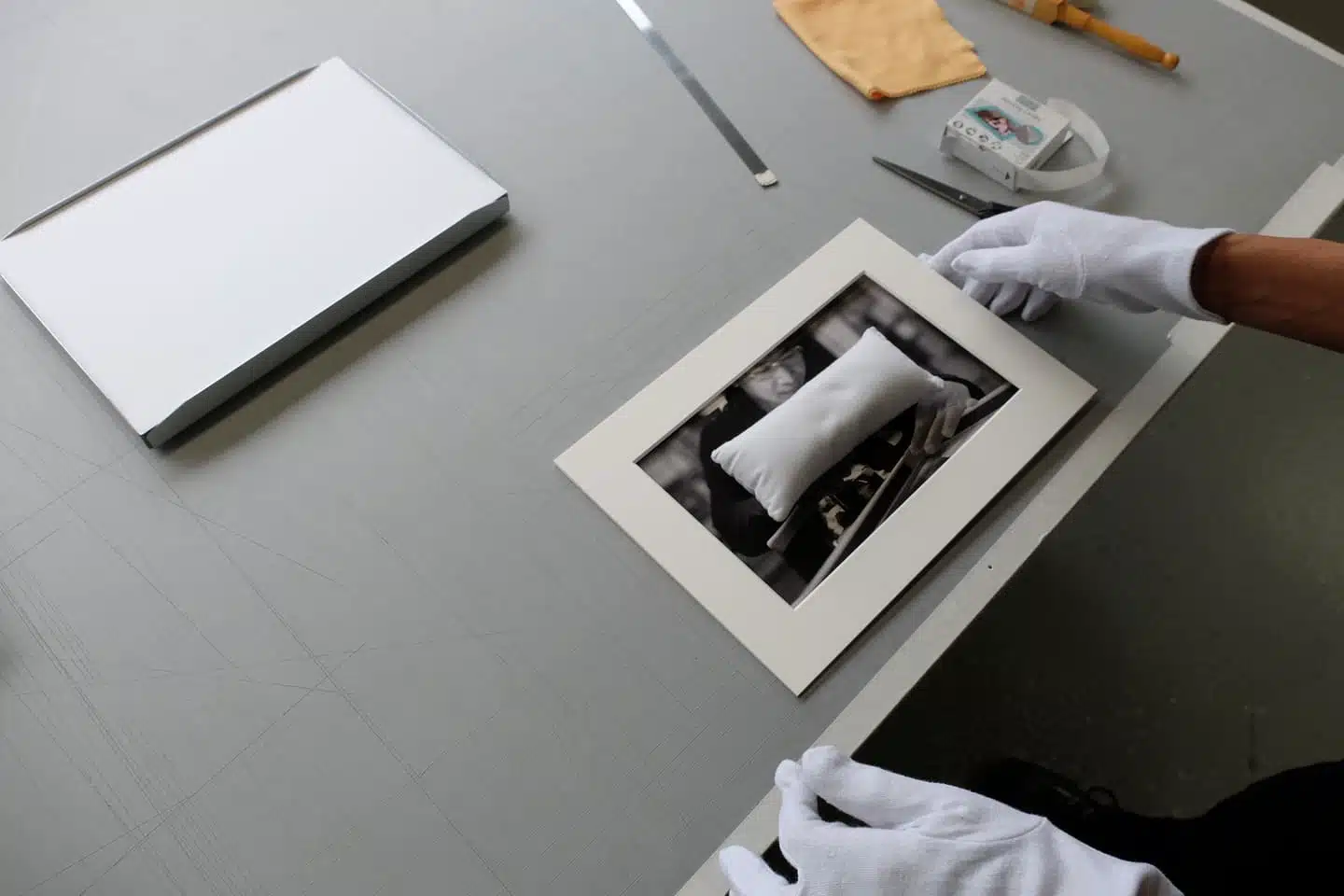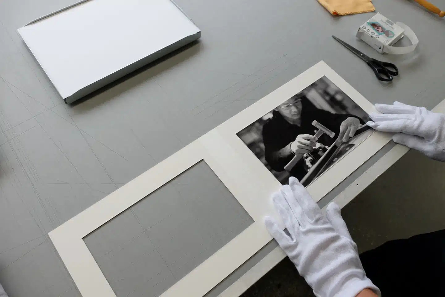 Damit das Bild nicht im Ausschnitt verrutscht, sollte es fixiert werden. Bei reproduzierbaren Bildern oder bei geringerem konservatorischem Anspruch reicht die einfache und schnelle Fixierung mit Klebestreifen. Gerade bei empfindlichen Werken und Unikaten ist es besser, auf jeglichen Klebeauftrag zu verzichten und die Montage reversibel zu halten. Dafür eignen sich Klapp-Passepartouts, auf deren Rückwand die Bilder mit Fotoecken gehalten werden. Der Vorteil dabei: Es ist kein Kleber am Bild, und das Bild kann im Klapp-Passepartout ausgerahmt und gelagert werden – ohne das Risiko einer Beschädigung.