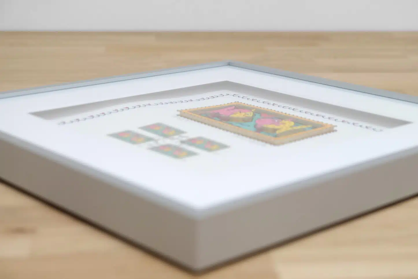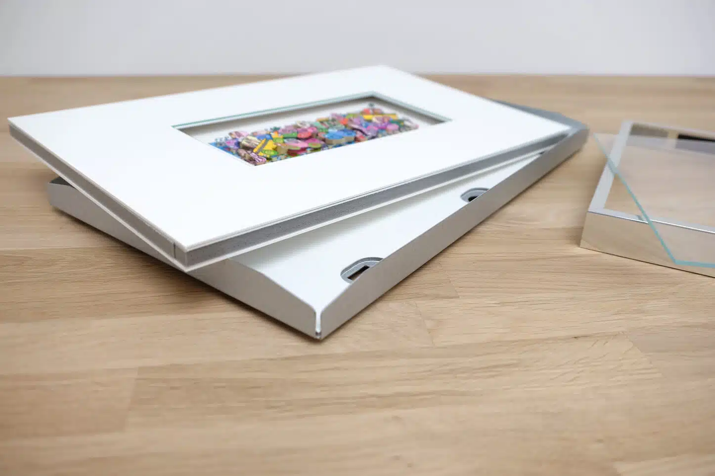 Statt in einem bereits unterfütterten Passepartout wird hier die 3D-Arbeit auf einem Hintergrundkarton montiert, sodass sie mittig im Rahmen befestigt ist. Dann werden die Distanzleisten magnetisch eingelegt, und darüber kommt ein ganz klassisches 3mm Passepartout. Nun muss nur noch das Glas eingesetzt und der Überrahmen angedrückt werden, und die Arbeit ist perfekt eingerahmt!