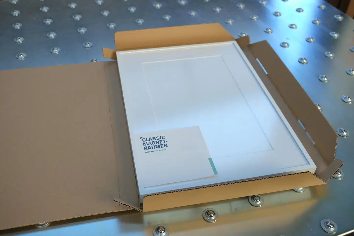 Sofern Ihre Bestellung keine große Stückzahl umfasst, werden die verpackten Rahmen zum Schluss zusätzlich in einen maßgefertigten Versandkarton verpackt.